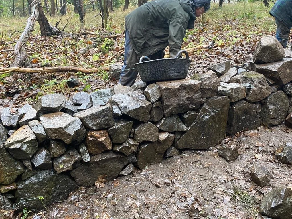 Eight members attended the final event of the season, including new members Elaine and Alec, not including Trish’s little dog Taz. Iain welcomed us with hot drinks, stone laid out ready, and a dog-walking service. The trees kept the worst of the drizzle off us until mid-afternoon. We wrestled with the fantastic shapes of Rosyth basalt…